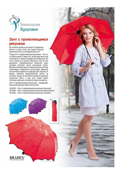 Зонт оборудован механической системой – открывается и закрывается вручную. Чтобы продлить срок службы проявляющегося узора, рекомендуется сушить зонт в развернутом виде: В сложенном виде носите зон в защитном чехле.